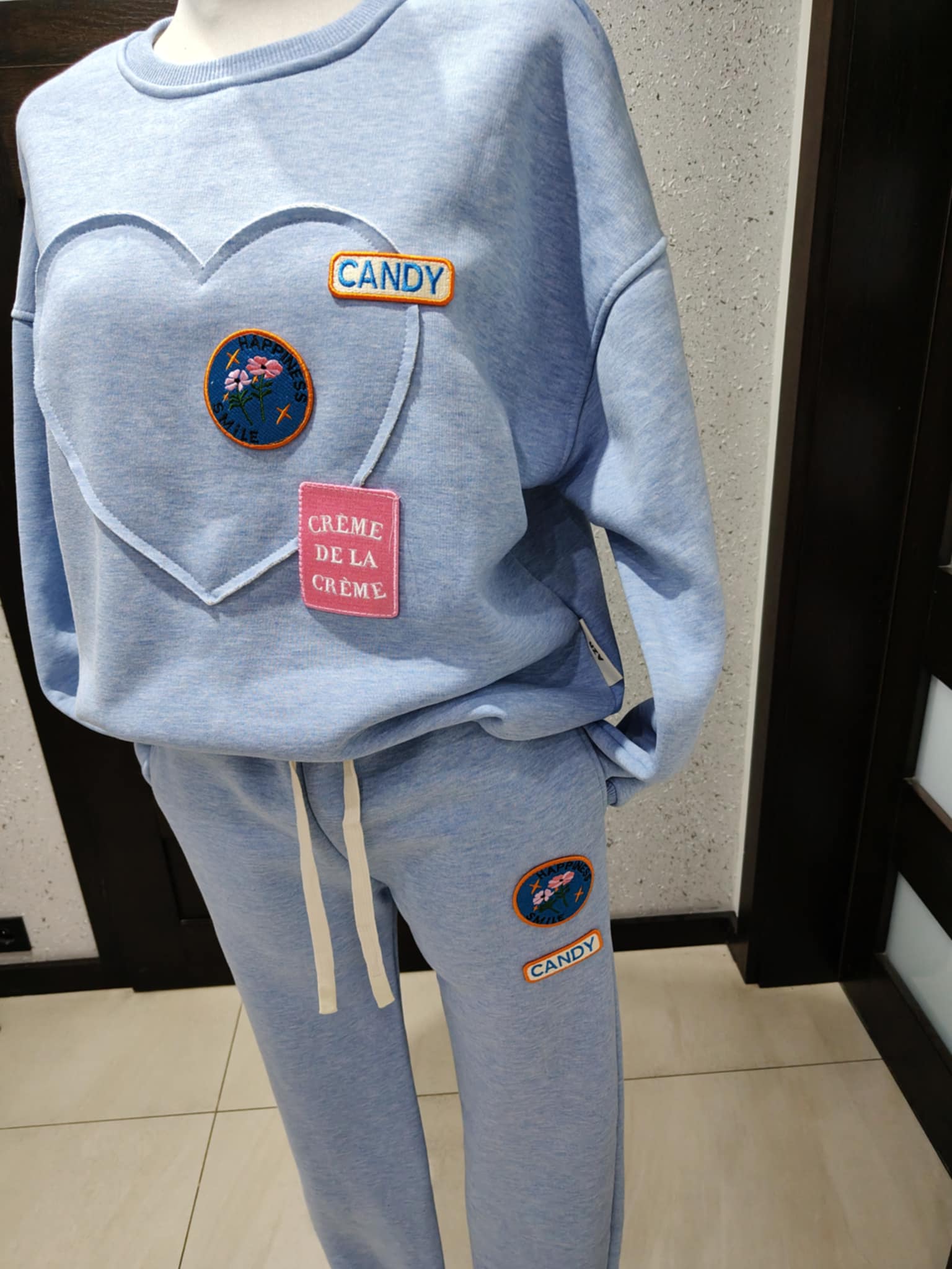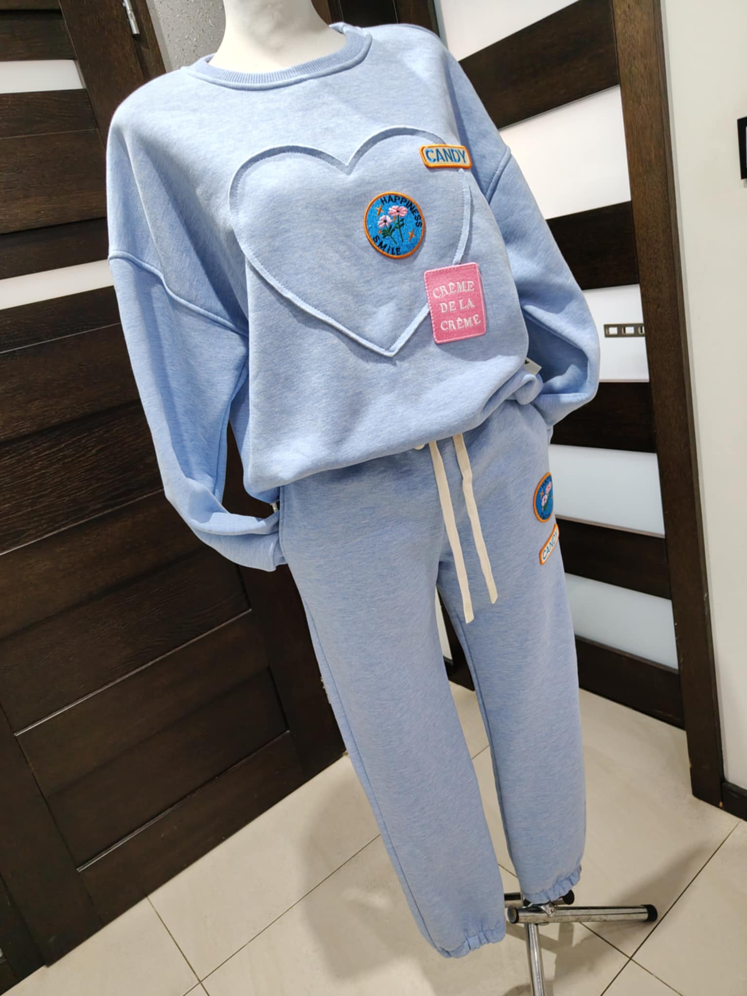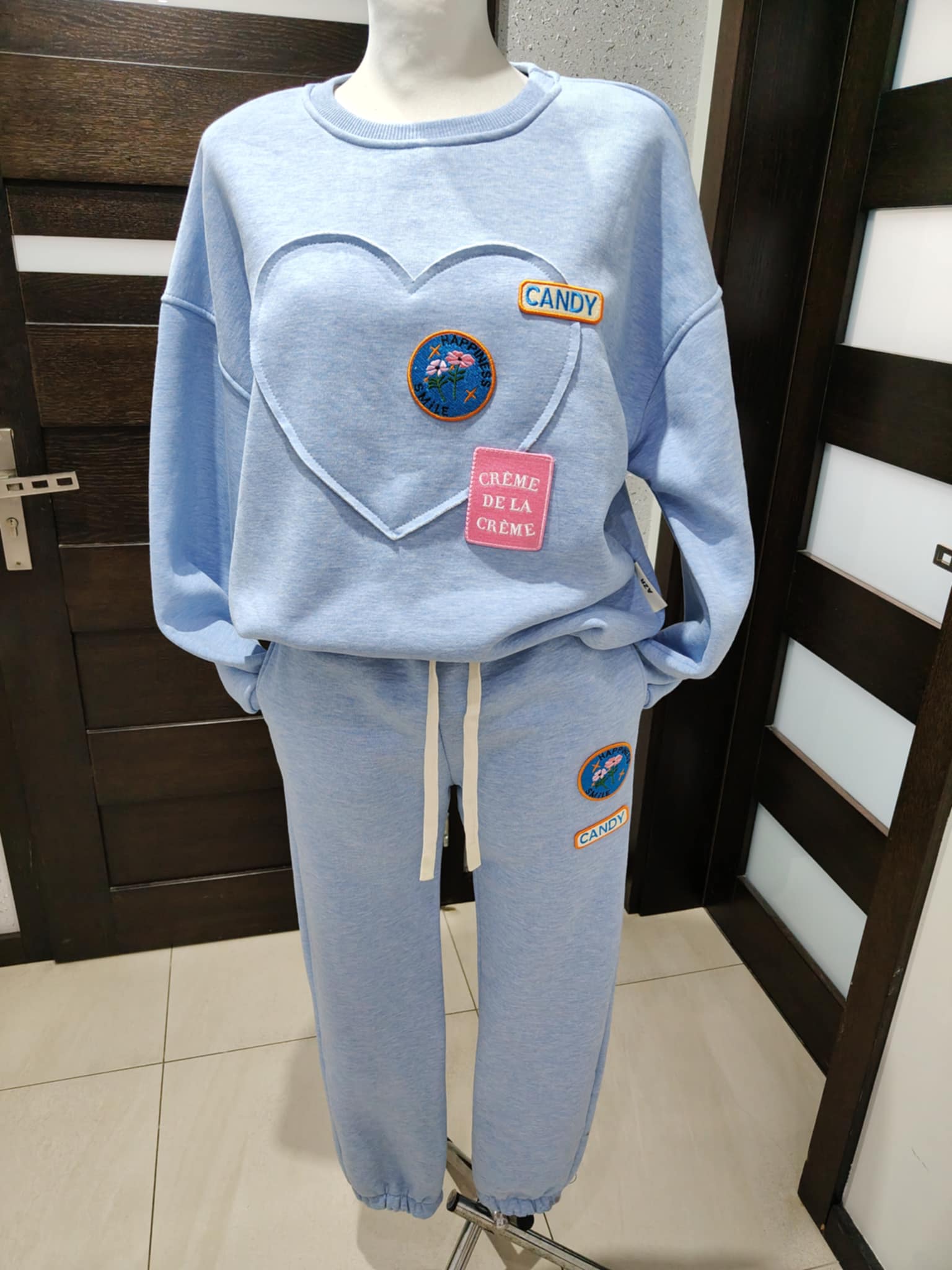 Polecam świetny komplecik renomowanej marki AZARA  skład którego wchodzi bluza z serduszkiem po środku plus spodnie dresowe z nogawką na ściągaczu i gumką w pasie. Możliwość dodatkowego ściągnięcia troczkami. Komplecik ocieplany więc idealnie nada się na chłodne dni.