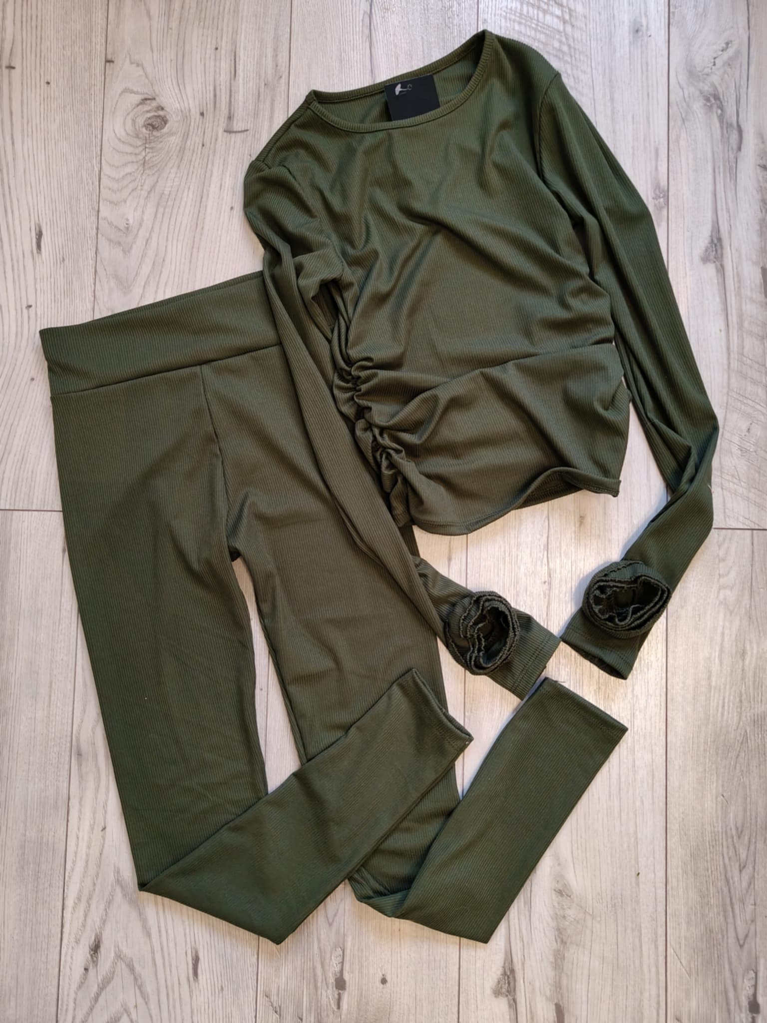 Ten komplet damski składający się z prążkowanej bluzki z długim rękawem z możliwością założenia na kciuk ,