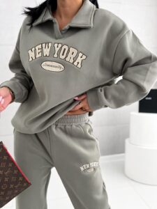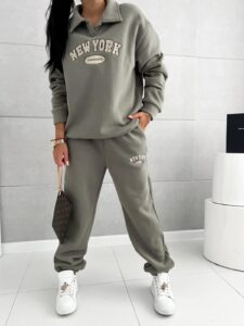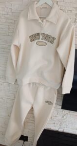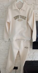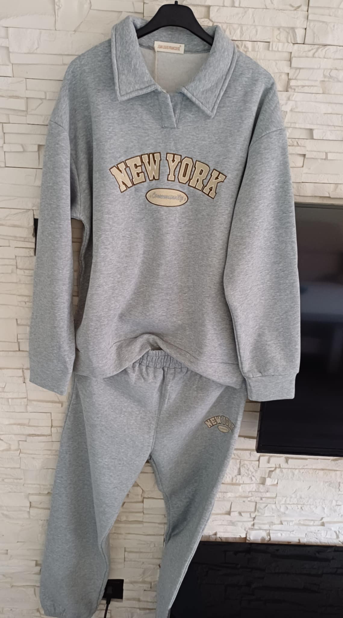 Bluza fason oversize , z kołnierzykiem. Spodnie z szeroką i super uciągliwą gumką w pasie, nogawka zakończona ściągaczem. Po bokach posiadają kieszenie.