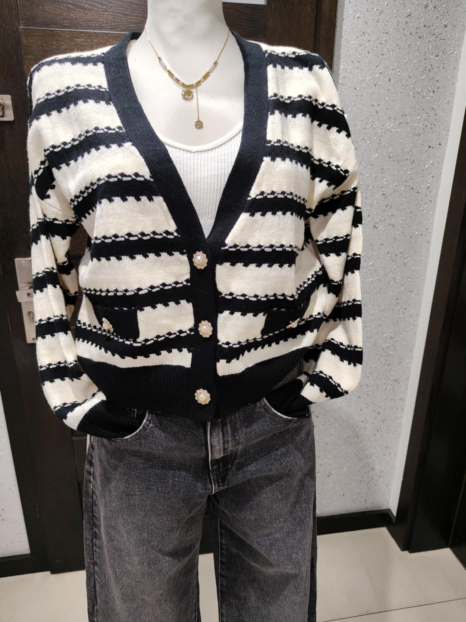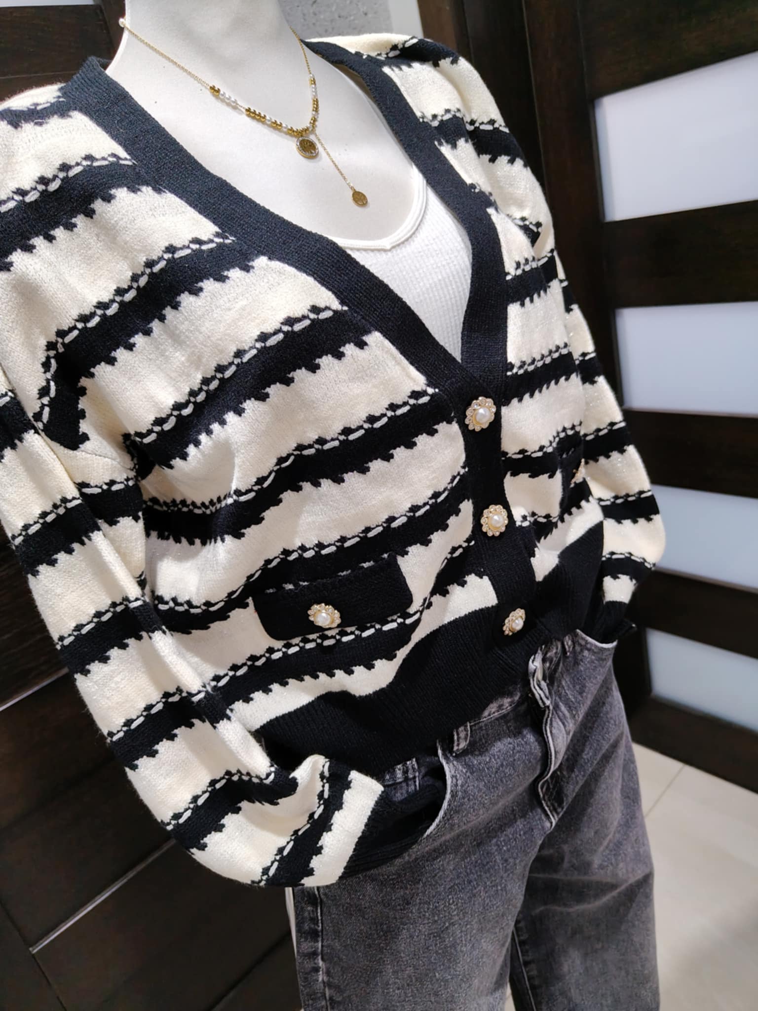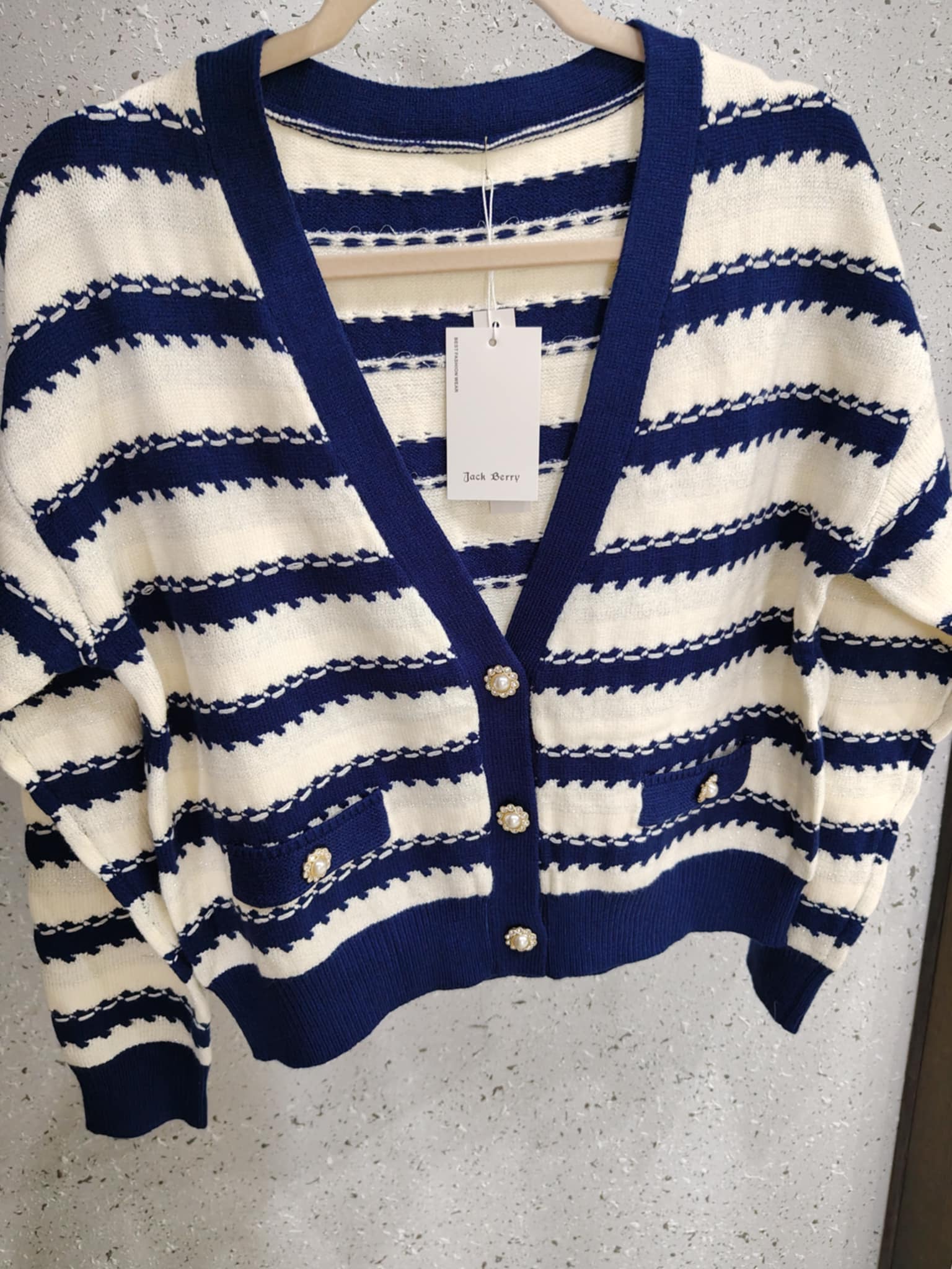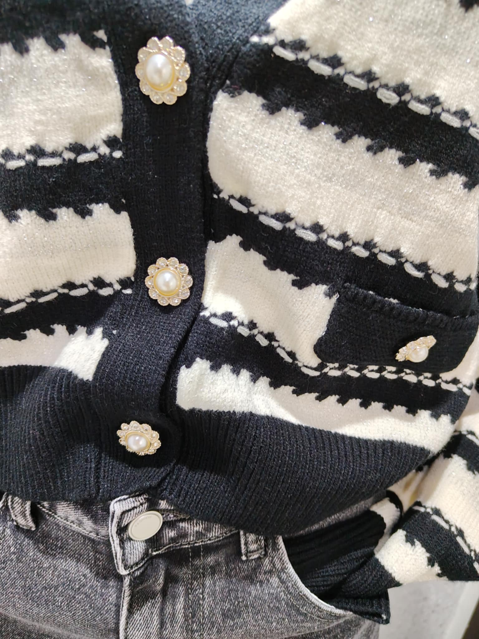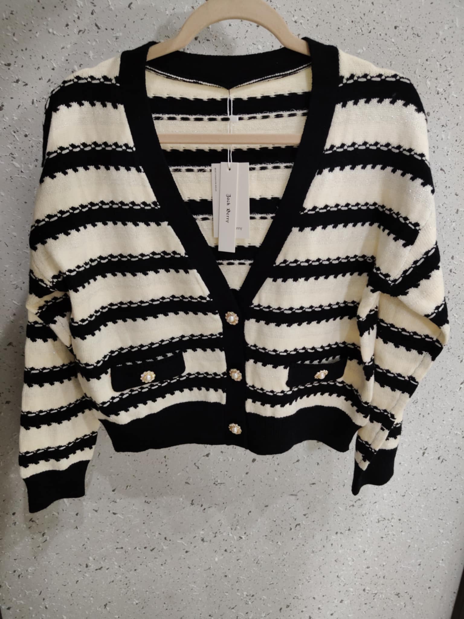 Śliczny krótszy sweterek , zapinany na piękne ozdobne guziki z cyrkoniami , z dodatkiem błyszczącej nici. Cudnie mieni się w świetle.