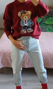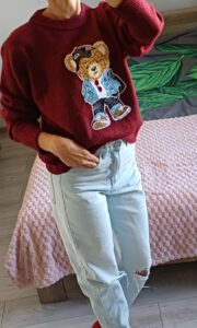 Po środku słodka aplikacja z misiem w czapeczce. Ściągacz na dole sweterka oraz przy rękawkach zapewnia lepsze dopasowanie.
