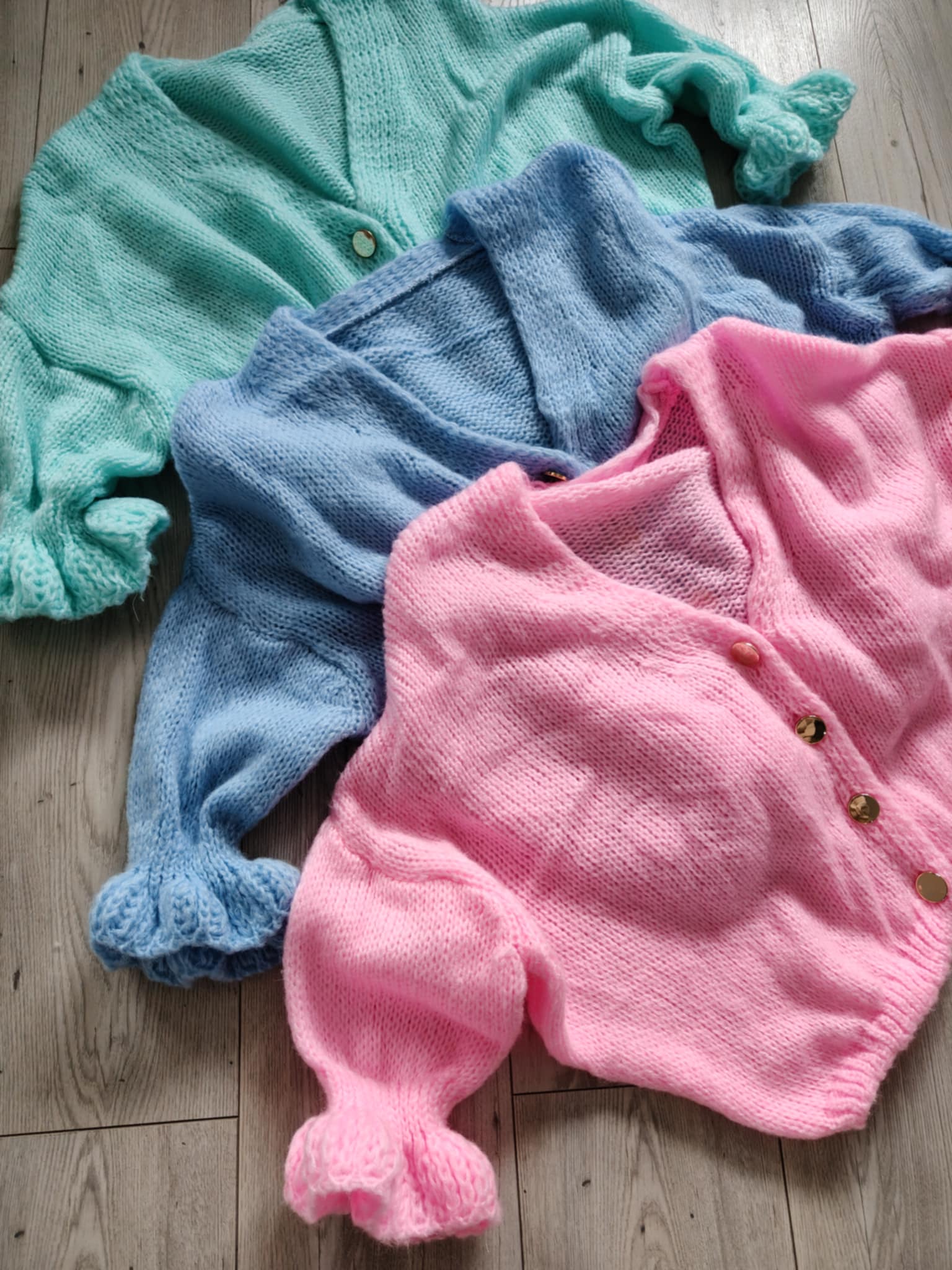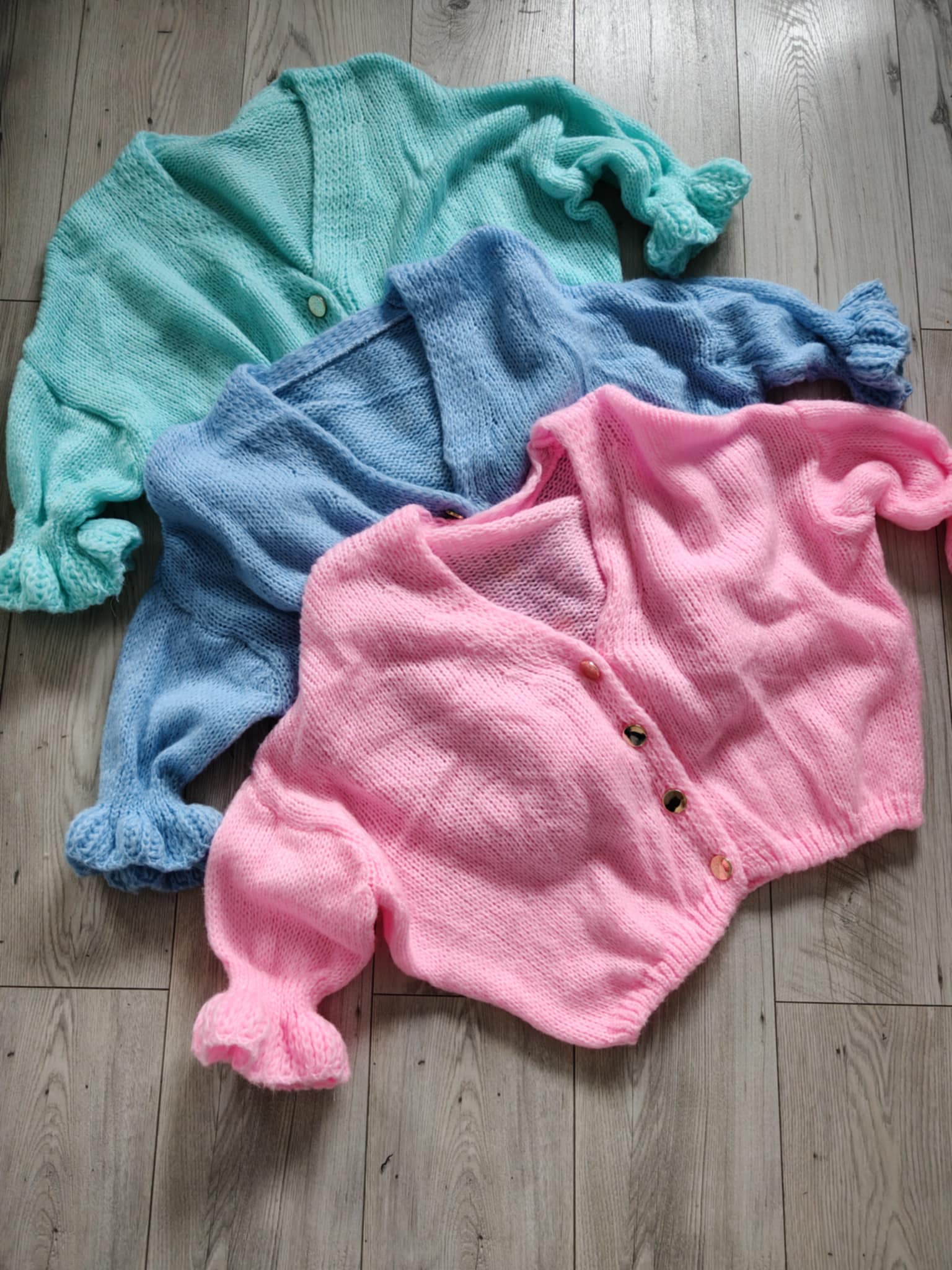 Polecam słodkie sweterki z najnowszej kolekcji wiosennej z rękawkiem zakończonym falbanką.