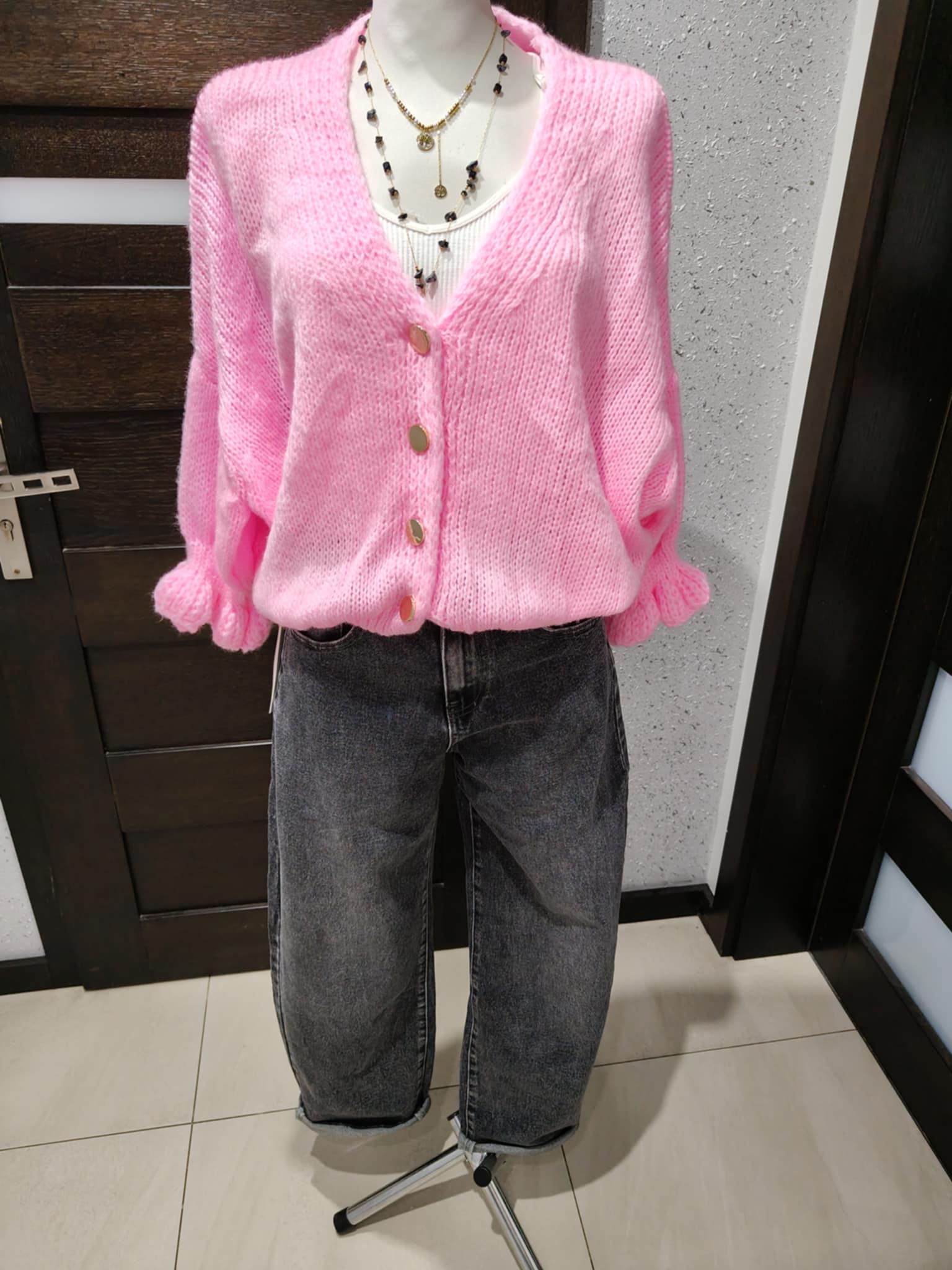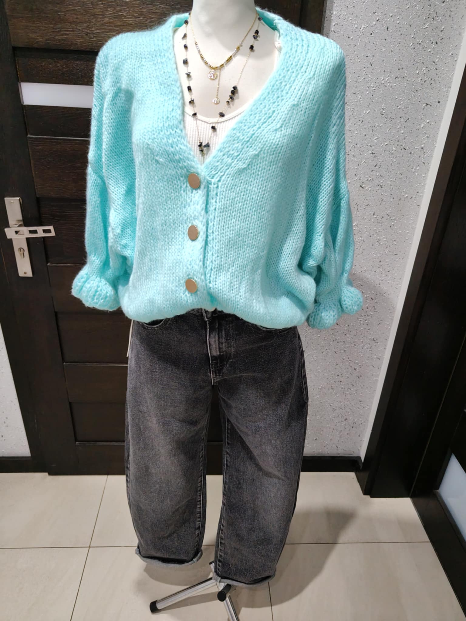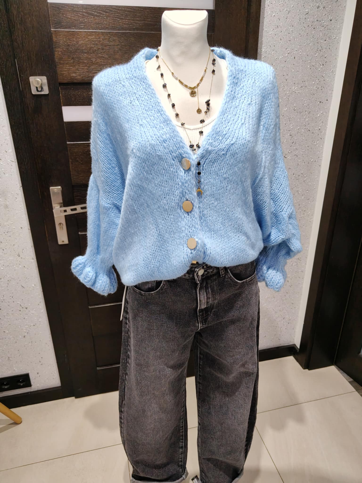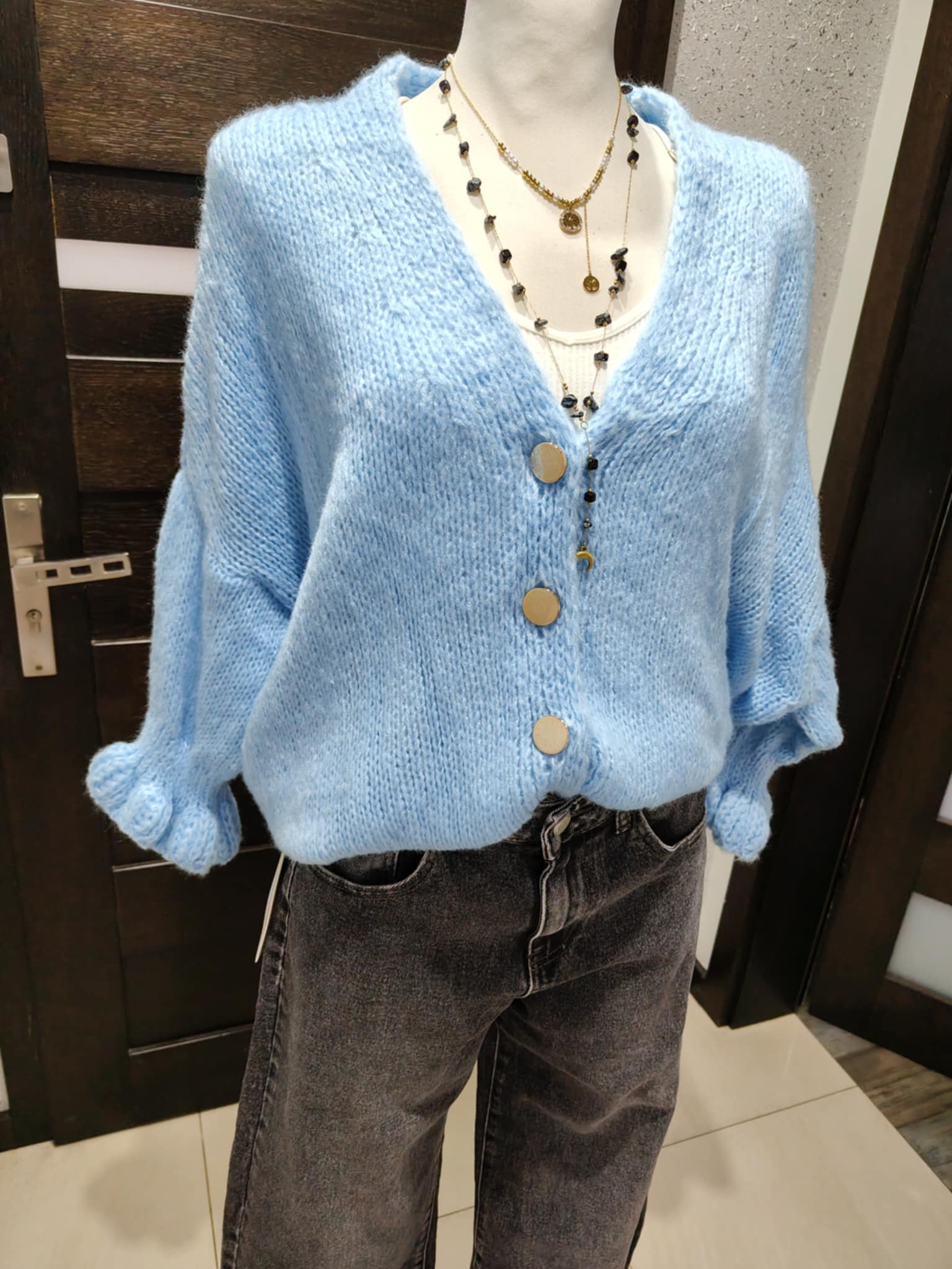 Zapinany na złote guziczki. Mega przyjemny i miękki w dotyku, nie gryzie. Sweterek można opuścić na jedno ramię, będzie wyglądać bardzo efektownie i zmysłowo.